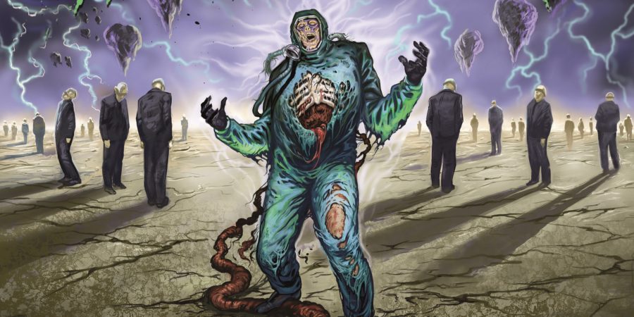 Nach einer kurzen Umbaupause macht Heavy Kevy, Frontmann von INSANITY ALERT, schnell klar, dass es nicht ganz so düster weitergeht. Vom ersten Ton im Soundcheck bis zur letzten Note wird hier nicht nur den Nacken- sondern auch den Lachmuskeln so einiges abverlangt. Passender Weise nutzt der Lichttechniker die helleren Farben wesentlich häufiger, um die vier Jungs auf der kleinen Bühne ins rechte Licht zu rücken. Diese lassen sich nicht lumpen und verfeinern ihre musikalisch auf hohem Niveau vorgetragene und mitreißende Thrash-Party mit zahlreichen Gimmicks. Mal ist es das Brillengestell mit den federnden Augen im Comic-Stil, mal sind es die kurzerhand übergestülpten Scherenhände oder auch die sehr an Spongebob erinnernde Styropormaske, die für Abwechslung und zusammen mit weiteren witzigen Ideen und den Ansagen von Kevy für einige Lacher sorgen. Spätestens als die vier Österreicher zum Abschluss ihre Interpretation des IRON MAIDEN Klassikers “Run Through The Hills“ herausholen und – unterstützt durch hochgehaltene Schilder mit dem “Mitsingtext“ – gefühlt jede Kehle im Club den neuen Refrain (“Run Through The Pit! Mosh For Your Life!“) gröhlt, dürften einige der Anwesenden INSANITY ALERT als Entdeckung des Abends vermerken.