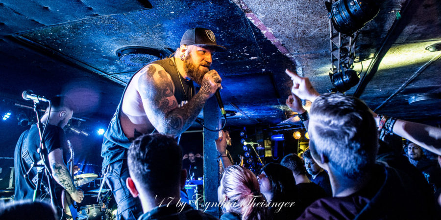 Nach einer kurzen Umbaupause betreten TO THE RATS AND WOLVES die Bühne und starten den heutigen „Hauptkampf“, wenn man dem Titel der Tour trauen kann. Sofort nachdem die Truppe zu den letzten Tönen des Intros (EIFFEL 65 – „Blue“) die Bühne entert, geht die Stimmung durch die Decke. Und das nicht nur bei den Fans – auch bei der Band, insbesondere bei den beiden Sängern, die auf der Bühne hin und her flitzen, als gäbe es kein Morgen. Dabei müssen beide – auch wenn sie nach eigener Aussage „nicht die Größten sind“ – ständig aufpassen, dass sie sich nicht den Kopf an der sehr niedrigen Clubdecke stoßen. Dass an diesem Tag Sonntag ist, macht den Umstand der Eskalation nicht besser, so dass die Band kurzerhand alle auffordert „auf den morgigen Tag zu scheißen“ und ordentlich abzufeiern. Leider ist der Club mit seiner Deckenhöhe auch nicht wirklich nett zu Crowdsurfern, wie wir spätestens bei dem Aufruf, alle Frauen auf die Schultern zu nehmen, merken. Wer hier den Kopf nicht eingezogen hat, hängt wirklich genau unter der Decke. Dies scheint aber zum Glück niemanden zu stören, denn Crowdsurfer beobachten wir trotzdem den ganzen Abend über.