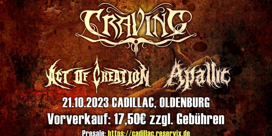 CRAVING haben im Mai nach sieben langen Jahren endlich ihr neues Album „Call Of The Sirens“ auf die Welt losgelassen und seitdem auch schon die ein oder andere Show gespielt, doch eine richtige Album-Release-Show war bisher noch nicht dabei. Grund genug für Bandkopf Ivan Chertov also, mit seiner Band die Location unsicher zu machen, in welcher für ihn vor 20 Jahren alles angefangen hat: Das Cadillac in Oldenburg. Für die muntere Homecoming-Sause sind noch zwei weitere Bands angereist, die das Vorprogramm bestreiten werden: APALLIC aus Emden und ACT OF CREATION aus Siegen. Damit sollte einem erfolgreichen Konzertabend nichts im Wege stehen.
