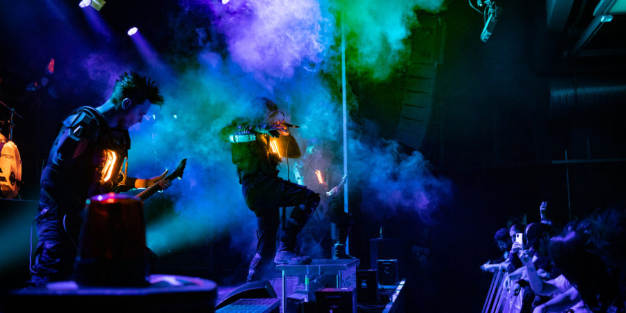 Die zweite Band DYMYTRY geht nicht nur Outfit-technisch eigene Wege: Sie sind vermutlich die einzige Band, die für’s Inland einen anderen Sänger haben als für außer-tschechische Gigs. Nachdem sie in ihrem Heimatland bereits fünf erfolgreiche Platten und eine Platin-Auszeichnung für das ausschließlich in Tschechisch gesungene Album „Revolter“ erhalten haben, sind sie seit Januar diesen Jahres auch bereit mit einer englischen und damit internationalen Version unter dem Namen „Revolt“ den Rest der Welt zu erobern. Am Mikro unterstützt sie dabei hierzulande statt Protheus die starke Stimme von Alen “A.L.” Ljubic und bereits nach wenigen Minuten Spielzeit ist klar: Der Plan geht auf und die Jungs funktionieren zusammen wie geschmiert! Gemeinsam und allesamt in edgy Klamotten und Masken gehüllt erinnert ihr Psy-Core nebst Ambiente ein wenig an MUSHROOMHEAD und FIVE FINGER DEATH PUNCH, vielleicht aber insgesamt mit weniger Härte. Aber langweilig wird’s trotzdem nicht: „Chernobyl 2.0“ überzeugt durch die Riffs und das Drumgewitter, „Never Gonna Die“ bewegt bis zu den letzten Reihen und die DYMYTRY-Version des Klassikers „Somebody’s Watching Me“ wird lauthals mitgesungen. Dazu bekommen wir ein fulminantes Drum-Solo von Miloš Meier und mehrfache einhändige Räder des Gitarristen Jiří Dymo Urban. Was will man mehr?!