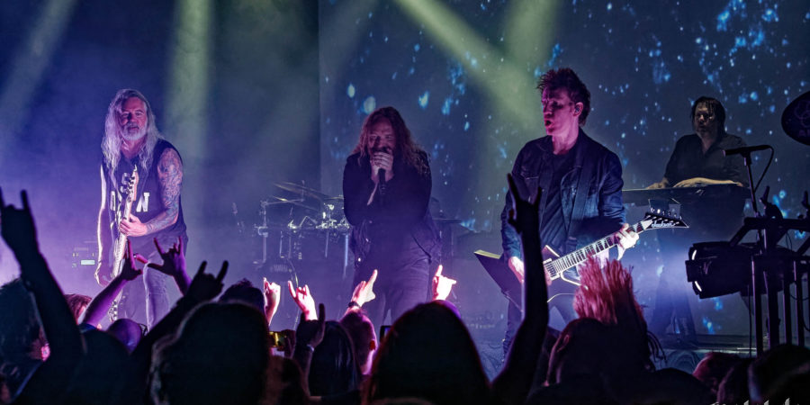 Diese beginnen ihr Set mit einem ausgiebigen Intro, das neben reichlich Atmosphäre auch ein paar U-Boot-Geräusche enthält. Zusammen mit dem blauen Licht, in das die Bühne gehüllt ist, kreiert dies einen Eindruck von dunkler Tiefe und Kälte. Das perfekte Setting also für die Düsternis, die nun folgen wird. Als EVERGREY auf die Bühne kommen und mit „A Silent Arc“, ebenfalls Opener des aktuellen Albums „The Atlantic“, starten, erhebt sich aus dem Publikum der zu erwartende Jubel. Durch Mark und Bein geht der Bass, der im gut abgemischten Sound für den notwendigen Druck sorgt. Mitreißend und melancholisch wird es direkt während des ersten Tracks, was neben dem von Fronter Tom Englund gespielten Solo vor allem an seinem gefühlvollen Klargesang liegt. Diese Elemente tragen auch den nächsten Song, „Weightless“, der sich gleichzeitig aber deathiger zeigt und die Stimmung im Zuschauerraum noch steigert.