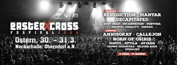 Es ist Samstag, der 30.03.2024, 16:00 Uhr und die Neckarhalle eröffnet bestens vorbereitet ihre Türen für die Schaulustigen. Der Plan für die beiden anstehenden Tage kann dabei unterschiedlicher nicht sein: Mit Bands wie NERVOSA, DUST BOLT, DECAPITATED, MANTAR und nicht zuletzt den Knüppel-Legenden von BENEDICTION ist der Samstag dem Thrash und Todesmetall gewidmet, während der Sonntag mit AVIANA, ATTILA, IGNITE, BORN OF OSIRIS und ANNISOKAY core-lastiger und melodischer von statten geht.