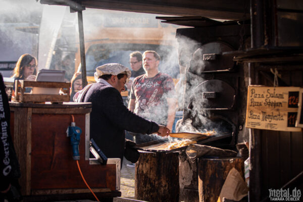 Vor dem Eingang stehen wie gewohnt drei Foodtrucks. Wieder dabei sind der Schulbus von Graf Food on Wheels und der Stand vom Gasthof Hecht. Es gibt daher Gyros, Currywurst, Schnitzel (sowohl für Omnivoren als auch für Vegetarier), Hot Dogs und verschiedene Variationen rund um Deutschlands liebste frittierte Knolle. Neu dabei ist Christian Teufel mit seinem Holzofen, der neben klassischer Pizza auch eine schwäbische Spezialität namens „Dinnede“, eine Art Flammkuchen mit dickerem Teig und ausgefallenen Belägen, serviert. Wer hier hungrig bleibt, ist selbst schuld. Nur eine Sache gibt es auch auf Nachfrage nicht: die stylische Pizzabäcker-Mütze. Aber man muss sich ja noch etwas fürs nächste Jahr aufsparen.