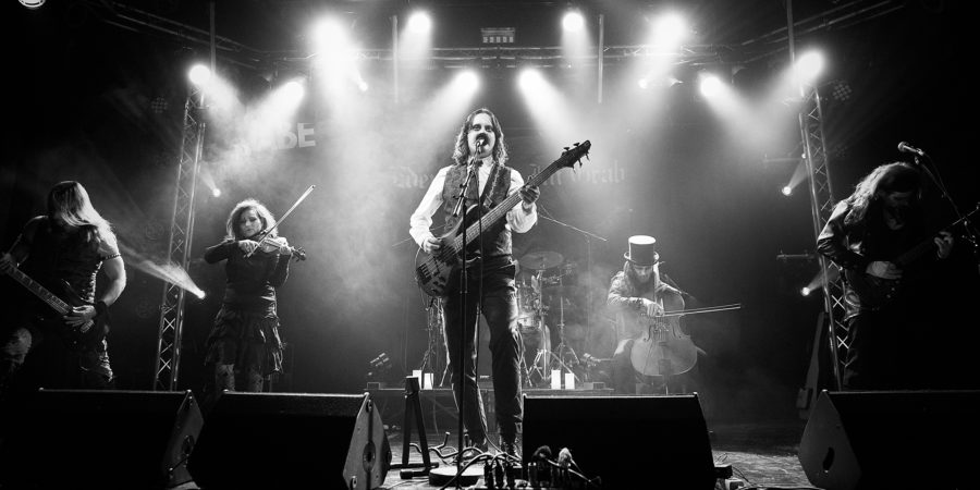 Heimspiel für EDEN WEINT IM GRAB, und es dürften sich viele bekannte Gesichter und treue Fans der Hauptsädter in der Wabe eingefunden haben. Jüngst ist „Tragikkomödien aus dem Mordarchiv“ erschienen und mit dem Opener „Meysterdetektiv“ startet auch das heutige Set. Der Sound in der Wabe ist gut, das Licht auch und die Theater-Bühnenoptik rundet das Schauspiel, der in ihre typischen Bandgewänder gekleideten Musiker, gelungen ab. Gut gelaunt, immer wieder durch flapsige Ansprachen aufgelockert entführen EDEN WEINT IM GRAB zu einer Reise durch die Diskographie. Vom Ohrwurm-Garanten „Lazarus und die Tücken der Einsamkeit„ über „An Die Nacht“ und „Exitus Der Schlange“ bis hin zum vorerst finalen Doppel-Schlag bestehend aus „In der Toten-Taverne“ und „Im Letzten Morgenrot“ bieten die Berliner ein ausgewogenes Programm. Insbesondere die älteren Songs und Klassiker zünden sofort und steigern die Stimmung erheblich, während das neue Material neugierig aufgesaugt wird. Den ersten Zugaben Akt beschließen EDEN WEINT IM GRAB mit „TraumTod“ und „Bon Voyage“, lassen sich aber von lautstarken Publikumsrufen noch einmal auf die Bühne zitieren. Denn bevor der Vorhang fällt, geht es noch einmal weit zurück in der Diskographie: Den Schlusspunkt setzt „Krieg im Wunderland“, ein echtes Schmankerl für treue Anhänger der Band. Herauszuheben ist, dass Geige und Cello, die live auf der Bühne dabei sind, und nicht, wie bei vielen Bands vom Band kommen, dem Klangbild einen einzigartigen Charakter verleihen, der sich imposant im Live-Material wiederfindet. Nach dem verdienten Applaus ist dann auch endgültig Schluss und sympathischerweise finden sich beide Bands noch am Merch ein, um Gespräche mit den Fans zu führen und für einige Fotos bereit zu stehen.