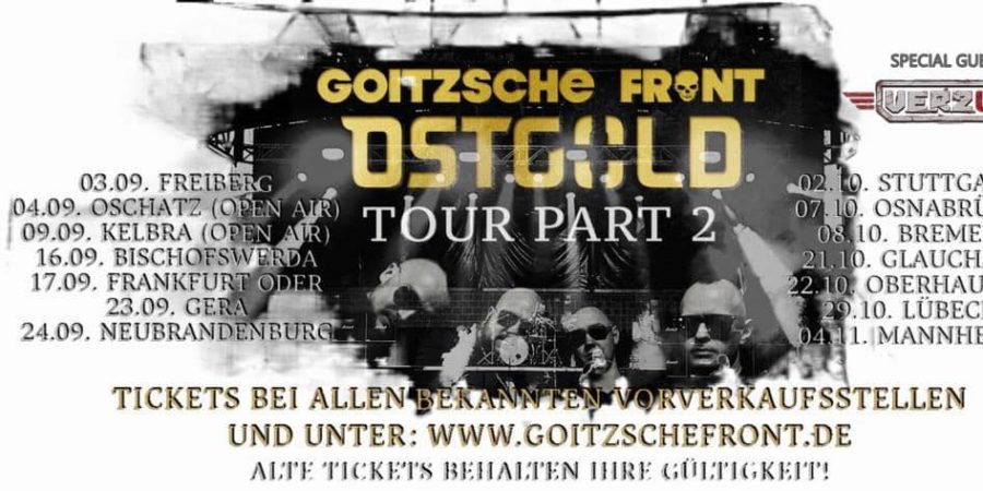 Knapp zwei Jahre nach dem ursprünglich angesetzten Termin können GOITZSCHE FRONT aus Bitterfeld endlich den zweiten Teil ihrer Tournee zum aktuellen Album „Ostgold“ spielen, das am 3. Januar 2020 veröffentlicht wurde. Trotz der langen Vorlaufzeit schien es im Vorverkauf der Tour nicht so gut zu laufen, wie es ja leider mittlerweile öfters vorkommt, das am Vortag eigentlich geplante Konzert im Hyde Park in Osnabrück wurde mit dem Termin im Bremer Tivoli zusammengelegt, da für Osnabrück unter 200 Karten verkauft wurden. Auch am Samstag Abend in Bremen wäre im Tivoli noch Luft nach oben für einige Besucher:innen gewesen. Das ist schon erschreckend, wenn man bedenkt, dass die Band anno 2018 noch das benachbarte und größere Aladin deutlich enger gefüllt hat. Trotzdem haben Band und Publikum Bock und das ist alles, was zählt.