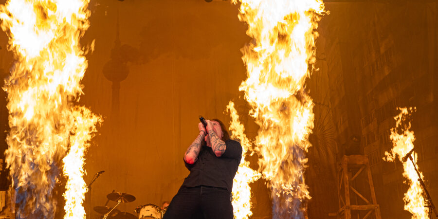 Aufgrund der ausverkauften Location sucht man sich frühzeitig einen guten Platz nur wenige Meter vom Mischpult entfernt. Denkste. Als HEAVEN SHALL BURN mit „War Is The Father Of All“ beginnen, kommt an den Lauschern wenig Zielgerichtetes an. Der Gesamtsound ist dumpf und die Gitarren haben wenig Durchschlagskraft. Als sich das auch beim nachfolgenden „Voice Of The Voiceless“ – einem Garanten für überkochende Stimmung – nicht ändert, geht es zwangsläufig ein paar Ebenen nach hinten. HEAVEN SHALL BURN in gedämpfter Lautstärke sind eigentlich ein No Go, aber so kommen die Thüringer wenigstens richtig an. Alles andere wäre auch unheimlich schade, denn, trotzdem die laufende Tour unter dem Banner des aktuellen Albums „Heimat“ steht, hat die Band etliche Klassiker eingepackt, inklusive solcher, die nicht so oft über die Bühnen wabern („Armia“).