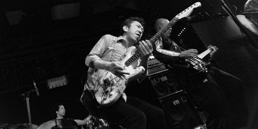 Einen kleinen Ausschnitt seiner Arbeit kennt fast jeder. Hat er doch mit seinem Beitrag zu “Kill Bill” (2003), “Battle Without Honor Or Humanity”, das Passieren eines Hotelflurs eigenhändig in ein Stück Filmgeschichte verwandelt. Doch sonst ist der Ausnahmegitarrist und eine der Legenden japanischer Rockmusik in Deutschland eher unbekannt. Dies schlägt sich auch im eher bescheidenen Venue heute Abend nieder und darin, dass nicht mal dieses ganz voll ist. Das Publikum ist bunt gemischt und auch ältere Semester sind darunter, was nicht verwundert, blickt HOTEI doch auf eine lange und sehr vielfältige Karriere zurück. Sein jüngstes Studioalbum “Strangers” haben wir letztes Jahr ausführlich besprochen.