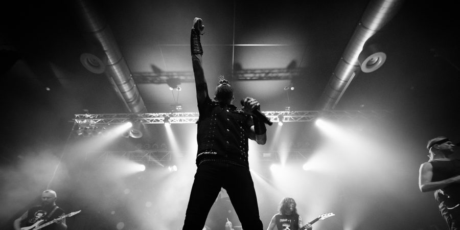 TENSIDE beginnen pünktlich 20:00 Uhr mit AC/DCs „Shoot To Thrill“ als Intro. In wie weit das stilistisch passt, sei dahin gestellt, gedanklich bin ich jedenfalls erst einmal bei „Iron Man“. Die Münchner geben sich alle Mühe, das Publikum in Gang zu bringen, aber so richtig will der Funke nicht überspringen. Das Huxley’s ist zwar schon gut gefüllt, aber die Leute tummeln sich eher an den Bars und im hinteren Bereich der Halle während es vor der Bühne noch viel Freiraum gibt.