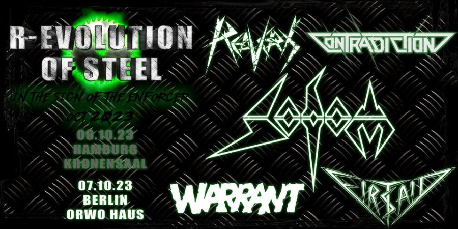 Die Konzertreihe R-Evolution Of Steel macht nach erfolgreicher Durchführung im Winter 2023 weiter und bringt die Bands REAVERS, CONTRADICTION, FIRST AID, WARRANT und den Headliner SODOM an einem ungemütlichen Herbstabend nach Berlin. Das mittlerweile bekannte ORWOhaus ist unter dem Motto „In The Sign Of The Enforcer 2023“ gut besucht, aber nicht ausverkauft. Überraschend, da gerade SODOM schon einige Zeit nicht mehr zu Gast in der Hauptstadt waren. Die Vorfreude ist dennoch groß.