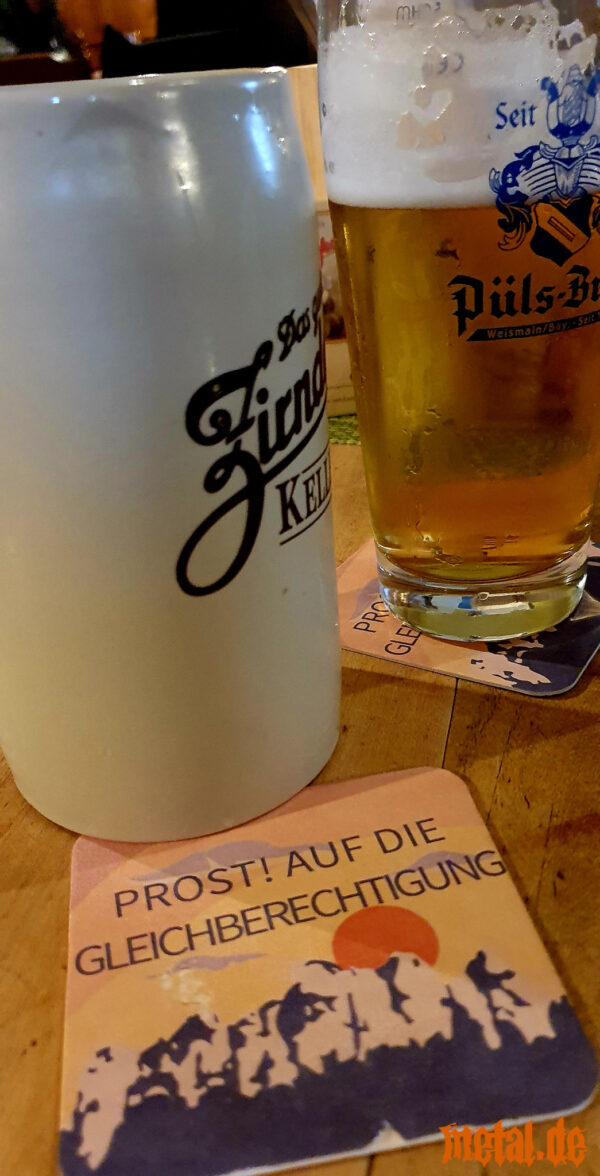 Viele Besucher:innen beginnen Ihr Ragnarök-Erlebnis in einem der urigen Wirtshäuser in Lichtenfels. Eine sehr beliebte Anlaufstelle ist der „Dümpelschöpfer“, wo sich Metalheads aus allen Himmelsrichtungen zum Vorprosten treffen. Wir auch – allerdings erst am Freitag. Auf den Bierdeckeln steht „Prost auf Gleichberechtigung“ – ein super Motto.