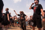 Fast noch zu früh für so eine Institution. Die Autogrammstunde haben RAGE bereits hinter sich – sehr sympathisch die Truppe um Peter „Peavy“ Wagner. Sympathisch ist erneut auch der Security-Mitarbeiter, der wieder den Wasserschlauch anwirft. Verzieh Dich doch mal, Sonnenball, zumindest für ein paar Stunden! Immerhin spielen hier RAGE, ganz in Schwarz gekleidet … ok, das steht zugegebenermaßen im starken Kontrast zur eher positiven Stimmung der Songs. „Don’t Fear The Winter“, erzählen uns RAGE dann auch. Wie lieb! Übrigens ein Lied aus der ganz frühen Ära: vom dritten Album „Perfect Man“ aus dem Jahr 1988. Der Sound ist top, die eine Gitarre drückt ordentlich und „Peavy“ ist stimmlich noch immer sehr gut unterwegs. Nur das Publikum, wenngleich vor Ort, agiert noch etwas reduziert. Was macht man da? Richtig, man geht zum Bühnenrand und beginnt zu klatschen. Was passiert? Richtig, die Menge macht mit. Dann kann es ja weitergehen: mit „Blackened Karma“ vom letzten Album „Seasons Of The Black“. Macht mächtig Laune, doch viele warten auf ein anderes Lied. „Higher Than The Sky“ ist ein Muss in vielerlei Hinsicht: Das Stück muss kommen, man muss dabei mitsingen und im Nachhinein muss man den Ohrwurm-Refrain erst mal wieder loswerden. Starker Auftritt einer großen Band!