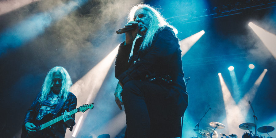 Obwohl in der Umbaupause Platz für SAXON geschaffen wird, reichte er nicht. Genauer gesagt die Höhe reichte nicht, denn vom Backdrop konnte man nur „Seize the day“ lesen, während das Bandlogo schon vom Drumset verdeckt wurde. Aber das war nebensächlich für die Performance der Band, denn der Fokus lag klar auf Biff Byford. Daran etwas zu ändern, wäre seltsam, angesichts der Entertainerqualitäten des 71-jährigen. Neben seinen launigen Ansagen waren es vor allem sein Tatendrang und der stets eingeschaltete Ventilator, die ihn zur optischen Attraktion des Abends machten. Sein Alter ist ihm trotz seiner bemerkenswerten Performance anzuhören, etwa wenn seine Stimme bei hohen Passagen kratzig klingt.