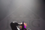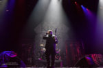 Ein Vorhang verdeckt das Treiben auf der Bühne – nur diejenigen, die seitlich vorne sitzen, können die fleißige Crew recht ungestört beobachten. So viel Privatsphäre muss wohl sein, wenn eine der erfolgreichsten Alternative-Metal-Formationen in der Hauptstadt spielt. Gegen neun Uhr fällt das übergroße Laken … und präsentiert eine üppig dekorierte Bühne mit riesigem Backdrop, verschiedenen Ebenen inklusive Aufgang und Treppe sowie einen stolzen, monströs anmutenden Kopf mit Hörnern, der über etwas prangt, das aussieht wie eine Tür. Die entpuppt sich im Verlauf jedoch als eine Art Videoleinwand, auf der dezent verstörende, leicht psychedelische Lichtmuster tanzen. Schön. Da hat man sich doch Mühe gegeben!