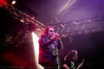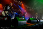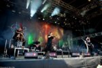 Als am Freitagabend pünktlich um Mitternacht ein dunkles Hämmern begleitet von einer atmosphärischen Lichtshow von der Pain Stage ertönte, hatten sich zahlreiche Fans mit Methörnern und Fellen bewaffnet vor der Bühne eingefunden, um mit den Trollfreunden aus Helsinki zu feiern. FINNTROLL waren gleich zu siebt angereist, und hatten neben ihren alten Klassikern natürlich auch das neuste Werk „Blodsvept“ im Gepäck. Mit dem Titeltrack wurde dann auch gleich kräftig losgehämmert, Humppa-Klänge trafen auf Black und Death Metal alter finnischer Schule, die Crowdsurfer ließen sich nicht lange bitten und auch ein ordentlicher Pit hatte sich bereits nach wenigen Minuten unmittelbar vor der Stage gebildet. Da spritzte das ein oder andere Bier, oder in diesem Fall wohl eher Met durch die Luft, bei den Refrains gaben sich die Zuschauer trotz den rein schwedischen Lyrics textsicher (trotz ihrer finnischen Herkunft singen FINNTROLL auf schwedisch, da es „verdammt trollisch“ klingt), und Fronter und Guttural-Spezialist Mathias „Vreth“ Lillmåns heizte das Publikum mit seinen amüsant klingenden Zurufen ordentlich an. Seine Deutschkenntnisse, die sich eigentlich nur auf Schimpfwörter beschränkten, sorgten für genauso gute Laune wie die beiden äußerst aktiven Gitarristen Skrymer und Routa, die von einer Seite der Stage zur anderen hetzten. Die Setlist war sehr zur Freude vieler Fans nicht nur auf neuere Songs beschränkt, die sich spätestens seit dem letzten Album von der Trollthematik abgewandt haben, sondern hatte am Ende mit „Trollhammaren“ und „Jaktens Tid“ noch zwei echte „Evergreens“ der Band im Programm. Ein würdiger Abschluss für die Party auf dem Infield, den die Zuschauer mit minutenlangen Jubelschreien nochmal ordentlich feierten.