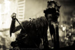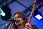 Seit Mitte der Neunziger pflanzen KAMPFAR durch ihr ganz eigenes Verständnis von Black Metal nordische Wälder in die Gehörgänge der Lauschenden. Die Herkunft klingt jederzeit an, und doch spielen die Norweger aufgrund des paganen Einschlags ein wenig neben der traditionellen Schwarzmetall-Welle; inzwischen jedenfalls. Nach einem ausdauernden Intro begann die Truppe um Fronter Dolk mit einem Stück vom aktuellen Album „Djevelmakt“ – man kann als norwegische Black Metal-Band kaum besser in ein Set starten als mit dem Wort „Helvete“. Die Bühne war auffällig beflaggt und behangen und die Farbe Rot schien omnipräsent; selbst der Mikroständer war entsprechend gefärbt. Scheinbar hatten so einige Lust auf harsche Klänge am frühen Nachmittag und so kamen etliche Jünger, um dem charismatischen Bandleader zuzuhören. Die Sonne brannte zwar wieder, das tat der düsteren, von nordischer Mythologie geprägten Mucke aber nicht weh. „I want to see some fucking horns“, und das Publikum gehorchte. Die Stücke entluden sich überwiegend im Midtempo-Bereich, da das Schlagzeugspiel aber stets variierte, ließ sich zum dargebotenen Material prächtig headbangen. Dolk hatte richtig Lust, war viel unterwegs, animierte, bedankte sich für den Support und zollte den Zuschauern aufgrund der immer wieder auftretenden Regenschauer seinen Respekt. Nett! Ein ewiges Highlight ist natürlich der Song „Ravenheart“, der als vorletztes gespielt und entsprechend angenommen wurde. Was bei einer KAMPFAR-Show auch nicht fehlen darf: der freie Oberkörper des Sängers, der zum letzten Stück jedoch von einer schwarzen Kapuzenkutte umhüllt war. Dolk zeichnete reichlich umgedrehte Kreuze in die Luft und so endete eine erhabene Show, die bei Dunkelheit sicher noch besser rübergekommen wäre.