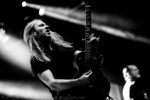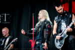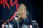 Überraschend war es schon, dass man die Schweden auf Main beobachten durfte. Um es vorwegzunehmen: Vermutlich erzielt das Songmaterial dann doch mehr Wirkung, wenn die Stage etwas kleiner und Band und Publikum mehr zusammen sind. So wurde man das Gefühl nicht los, dass die Bühne die Musiker immer wieder verschluckte – einfach eine Nummer zu groß. Hinzu kam ein ungünstiger Sound, weil die Samples zu laut eingespielt wurden und den Rest der Instrumente phasenweise zu sehr verdeckte. THYRFING hatten aber selbstverständlich Bock auf den Gig. Leder, Ketten, Kunstblut und schwarze Farbe ließen die Band wie Krieger erscheinen. Spätestens jetzt sollte der Sonnenball eigentlich wissen, dass er hinter eine dicke Wolke gehört, doch die Helligkeit blieb. So oder so entfachten Fronter Jens Rydén und seine musizierenden Kumpanen ein acht Songs umfassendes, schwarz angehauchtes, gut headbangbares Midtempo-Feuerwerk aus schweren Riffs, Viking und Pagan Metal-Atmosphäre. Rydén poste sowohl für die Zuschauer als auch für die Fotografen und verwendete das am Drumkit stehende Wasser standesgemäß nur zum Bewässern der Haare – zum Trinken war ja Bier da. Eine energische Darbietung, die die Anwesenden dann doch so sehr anfixte, dass auch in den hinteren Reihen brav beim „Hey, hey, hey“-Spielchen mitgemacht wurde.