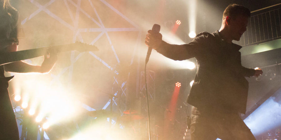 Die Bühne noch vollständig in Dunkelheit getaucht, erkennt man Schatten, die sich unscheinbar hinter ihren Instrumenten platzieren. Kurz noch ein Schluck Wasser, aus der am Rand drapierten Selter-Flasche. Kurz noch ein Ausrichten des Gitarrengurtes. Im Stillen, im Schutz des schummerigen Lichtes. Auf einmal erhellt gleißendes Licht alles im Umkreis von gefühlten 100 Kilometern. TESSERACT leuchten der Location heim und das wortwörtlich zu den ersten Tönen von „Luminary“. Die Progressive Metaler beginnen direkt mit einem Song aus ihrer neuesten Veröffentlichung „Sonder“, beginnen direkt mit perfekter Bühnen-Bambule.