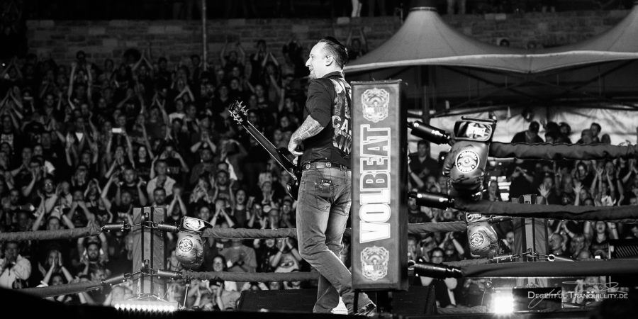 Der Headliner selbst darf als erstes den gut zehn Meter ins Publikum ragenden Steg benutzen, der in einer vier mal vier Meter großen Kleinbühne endet, die wie ein Boxring zurechtgemacht ist und größer sein dürfte als manche Klubs in denen die Dänen ihre Karriere begonnen haben. Weitere Hingucker sind die drei Videowände, auf denen links und rechts live die Band und in der Mitte Videos passend zu den Stücken gezeigt werden. Nach einem kurzen Voodoo-Dschungel-artigen Intro beginnen VOLBEAT mit “The Devil’s Bleeding Crown” kraftvoll einen viel bejubelten Auftritt. Die Playlist ist dabei bis auf eine gute handvoll Auswechslungen, die gleiche wie 2016 in der ‘Mercedes Benz Arena’. Spätestens bei “Sad Man’s Tongue” stehen alle und singen lauthals mit. Oft ist es mehr Rock, mehr die letzten zwei Alben, als der schnellere, härtere Stil, mit dem sie damals bekannt geworden sind. Das hält die Band und vor allem Gitarrist Rob Caggiano nicht davon ab, ordentlich loszulegen. Wird es dann mit Titeln wie “Slaytan” oder “Evelyn” doch mal rauer, wirken diese eher wie Ausreißer, haben etwas erzwungenes, als gehöre es halt dazu, aber eben auch nicht wirklich. Nicht mehr.