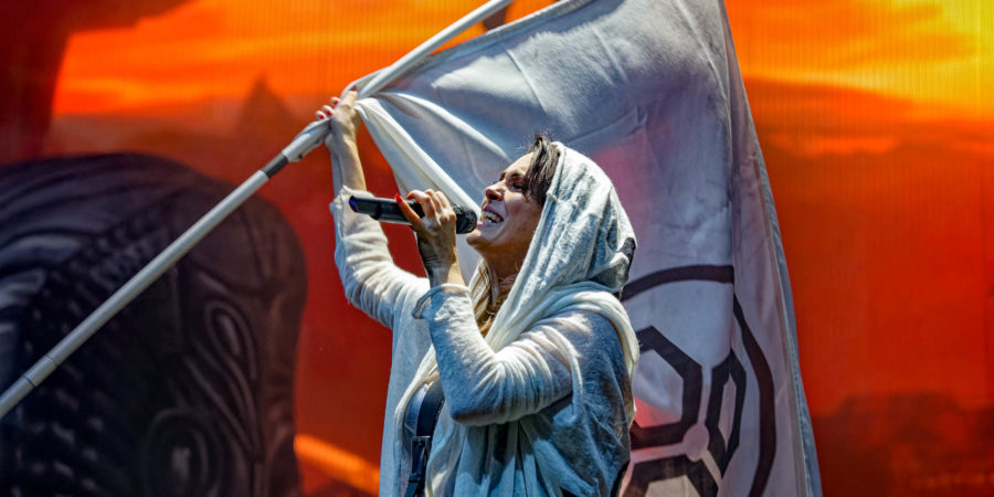 Die Show mit gleich drei Stücken eines noch unveröffentlichten neuen Albums zu eröffnen, zeugt von Selbstbewusstsein – und die Reaktionen geben WITHIN TEMPTATION recht. Die Menge nimmt die neuen Songs begierig auf, und feiert sie lauthals mitsingend ab. Musikalisch dürfte „Resist“ mit seiner futuristischen Schlagseite nach vorne weisen und gleichzeitig einen Schritt zurück in die eigene Vergangenheit darstellen. Weg von den großen Stadion-Rock-Hits mit charmantem Pop-Appeal, die den Vorgänger „Hydra“ auszeichneten, zurück zu dem härteren Düster-Goth-Sound, der gerade die Anfangsphase der Band prägte und bis heute nie ganz verschwunden war. Da ist es nur konsequent, dass der Schwerpunkt der heutigen Setlist neben den neuen Songs insbesondere auf der „The Heart Of Everything“-Scheibe liegt, während von „Hydra“ lediglich „Paradise (What About Us?)“ mit über die Videowände eingespieltem Konserven-Gastgesang von Ex-NIGHTWISH-Front-Diva Tarja Turunen zum Zuge kommt.