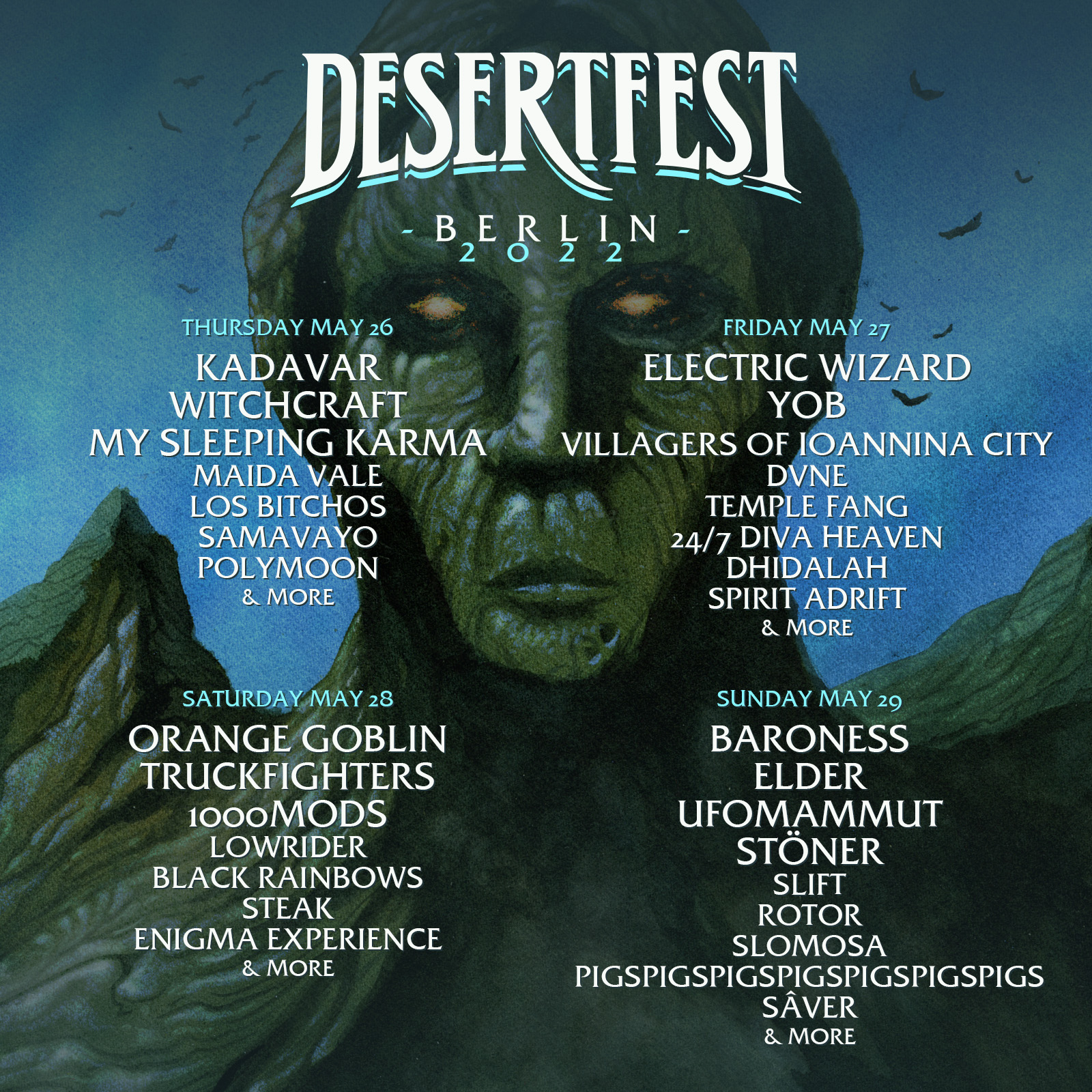 Als besonderes Geschenk an ihre treue Desertfest Gemeinde, wird das Festival in diesem Jahr nicht 3 sondern ganze 4 Tage stattfinden, vom 26. – 29.05. in der Arena Berlin. Alle 3-Tages-Ticketinhaber von 2020, erhalten automatisch Zugang zu allen 4 Tagen des Desertfest Berlin, das 2020-Ticket gilt somit für das gesamte Festival im Jahr 2022. Die Wochenendpässe sind ausverkauft sind. Tagestickets für Donnerstag und/oder den Sonntag sind noch verfügbar. Die noch verfügbaren Tickets sind auf www.desertfest.de erhältlich. Die Bands verteilen sich über die 4 Tage wie folgt: