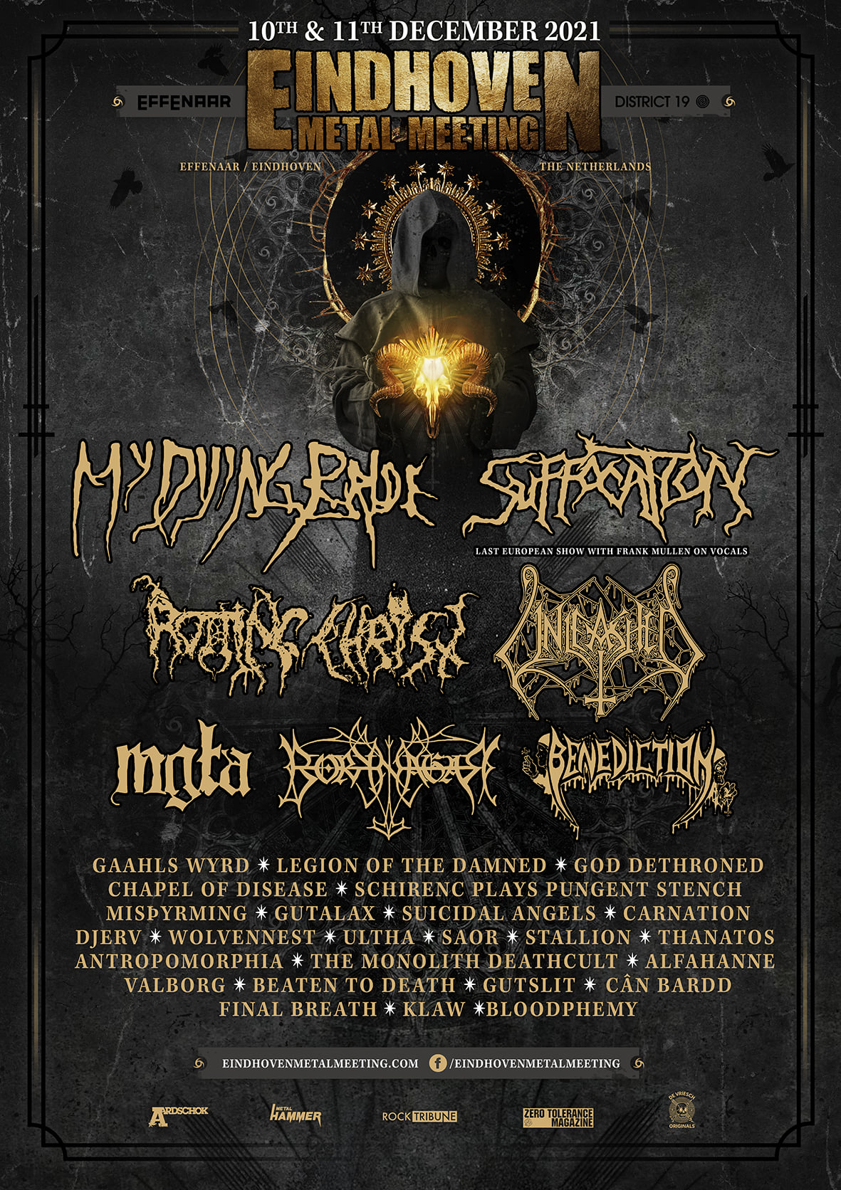 Bereits zum zwölften Mal findet am 10. und 11. Dezember 2021 das Eindhoven Metal Meeting statt – und das, obwohl aufgrund der aktuellen Corona-Regeln in den Niederlanden nur 75 Prozent der Tickets verkauft werden dürfen und das Festival nach eigener Aussage deshalb sehr unprofitabel ist. Dieses Jahr führen die Headliner MY DYING BRIDE und SUFFOCATION eine ganze Riege hochklassiger Bands an, darunter ROTTING CHRIST, UNLEASHED, MGLA, BORKNAGAR und BENEDICTION.
