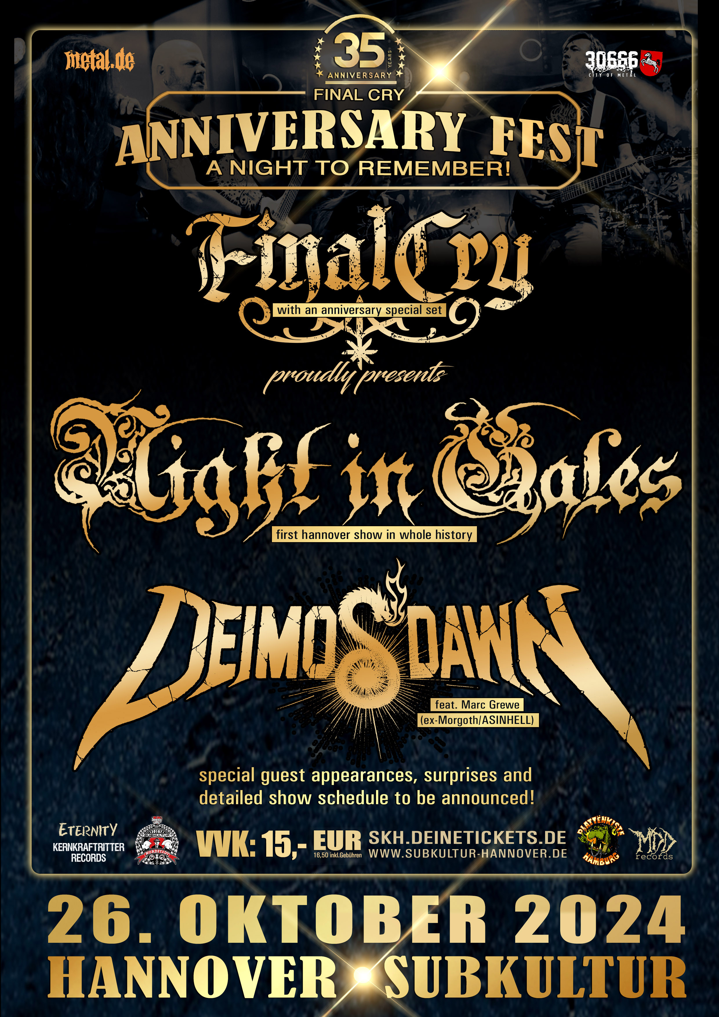 Für die Jubiläumssause ist einiges geplant. Die Band feilt an einem Extended Set, das Songs von nahezu allen sechs Alben der Band bieten wird und zudem sollen auch Freunde und alte Wegbegleiter einen Auftritt haben. Zudem wird eine gute Feier ja auch immer besser, wenn man sich genug Freunde einlädt und die sind in Form von NIGHT IN GALES, die ihr aktuelles Album „The Black Stream“ im Gepäck haben und tatsächlich noch nie in Hannover live gespielt haben, und DEIMOS‘ DAWN am Start. Ein weiteres Rahmenprogramm voller Überraschungen ist ebenfalls in Arbeit und wird zu gegebener Zeit bekannt gegeben. Die Band arbeitet dabei eng mit dem Verein „30666 City Of Metal e.V“ zusammen, der sie tatkräftig unterstützt.
