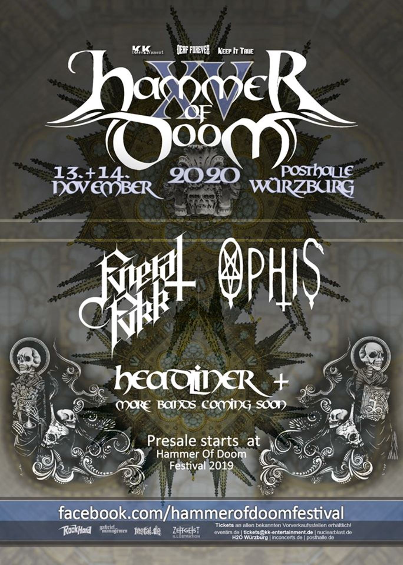 Das Hammer Of Doom XV findet vom 13.-14.11.2019 wieder an gewohnter Stelle in der Posthalle Würzburg statt. Als erste Appetithappen für 2020 sind neben FVNERAL FVKK, die mit ihrem Album „Carnal Confessions“ unlängst ein richtiges Brett hingelegt haben, auch die Hamburger Death-Doomer OPHIS angekündigt.