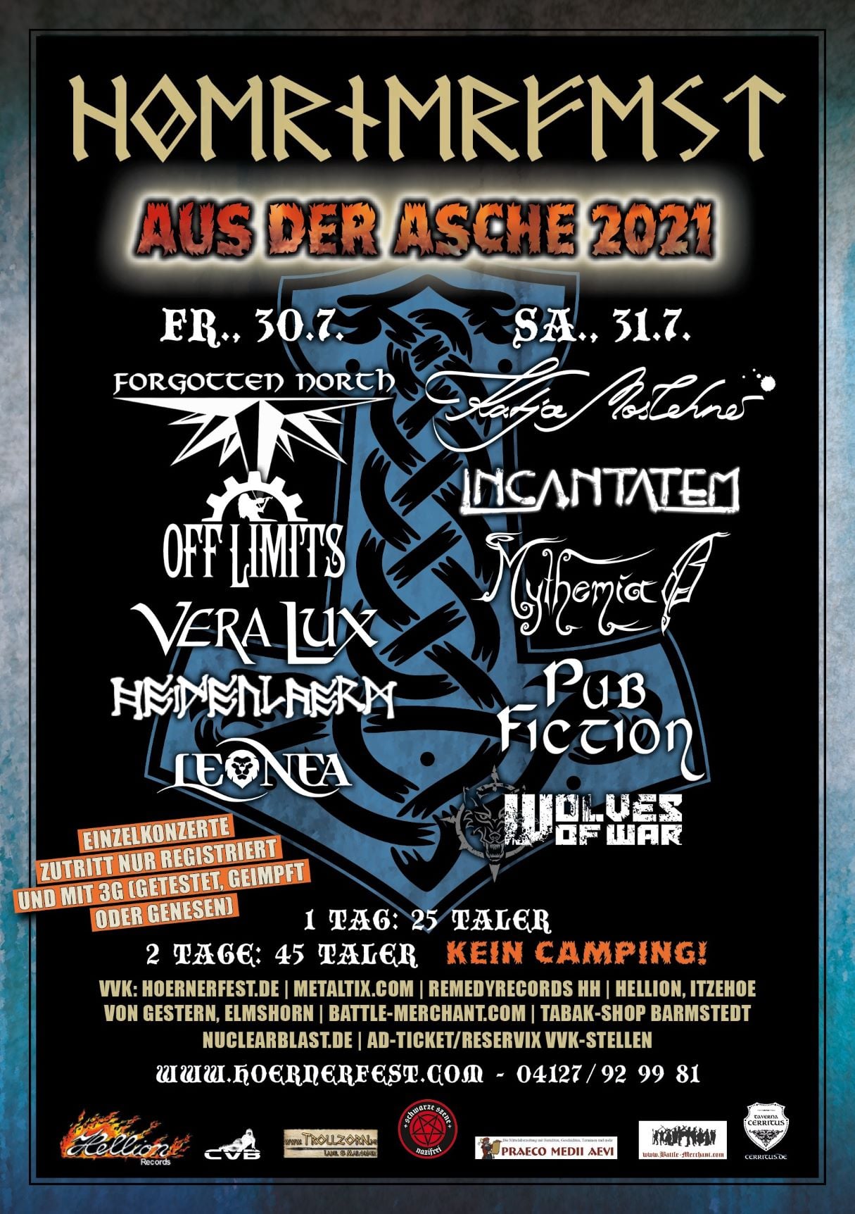 Wie für das Schwester-Festival Headbangers Open Air 2021 gilt auch für das Hörnerfest 2021: Billing lokal, jedoch ohne einen internationalen Farbtupfer. PUB FICTION kommen aus Bremerhaven und spielen einen Mix aus Folk Rock und Folk Punk. Folk- und Fantasy kommt aus Bielefeld mit MYTHEMIA. Die Band verbindet das Ganze noch mit mittelalterlichen Klängen und verwobenen Geschichten. Folk Rock und Steampunk aus Oldenburg spielen OFF LIMITS, düster wird es mit einem Mix aus Black Metal und Industrial mit der Hamburger Band WOLVES OF WAR. Der bisherige Output nennt sich „Dystopia“ aus dem Jahre 2018.