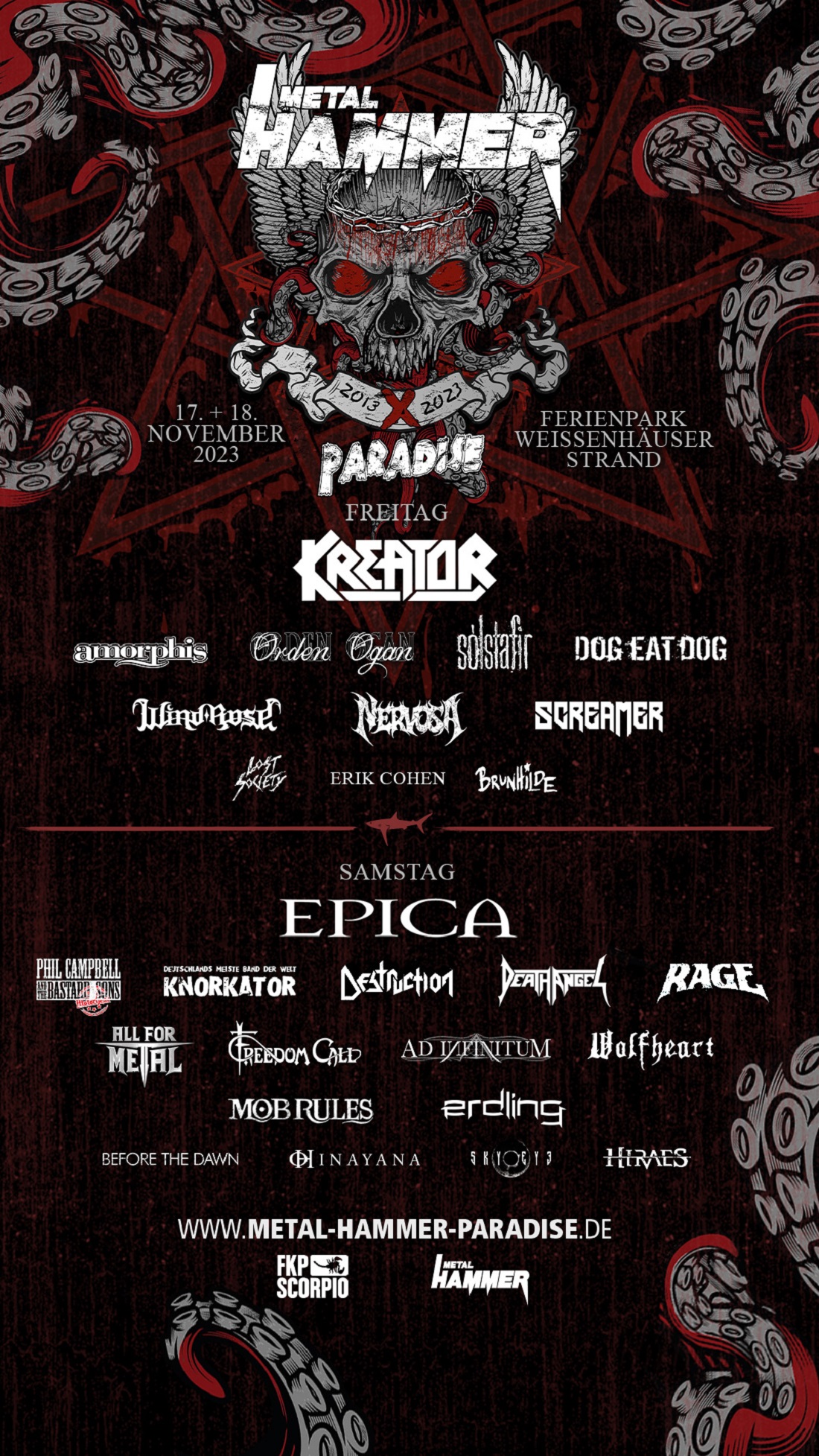 Erstmals beim METAL HAMMER Paradise wird die international aufgestellte Thrash-Metal-Formation NERVOSA auftreten. ALL FOR METAL – alles für Metal – ist nicht nur als Parole ebendieser neu angekündigten Band zu verstehen, sondern bildet zugleich ein passendes Motto für das 10-jährige Jubiläum des METAL HAMMER Paradise. FREEDOM CALL sind bereits seit Ende der 1990er aktiv und bezeichnen ihr Schaffen selbst als „Happy Metal“. Die multinationale Symphonic-Metal-Band AD INFINITUM um Frontfrau Melissa Bonny wird ebenfalls beim Metal Hammer Paradise 2023 zu Gast sein.