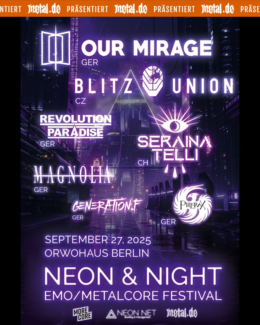 Das Neon & Night Festival ist ein junges Festival das am 27. September 2025 im Berliner ORWOhaus stattfindet und einen spannenden musikalischen Rundumschlag aus Metalcore, Emo, Post-Hardcore und Alternative bietet. Das Billing wartet mit Szenegrößen wie OUR MIRAGE (Post-Hardcore aus NRW), BLITZ UNION (Synth-Rock aus Tschechien) oder der Schweitzer Künstlerin SERAINA TELLI Telli auf und verspricht somit einen Abend voller Highlights.