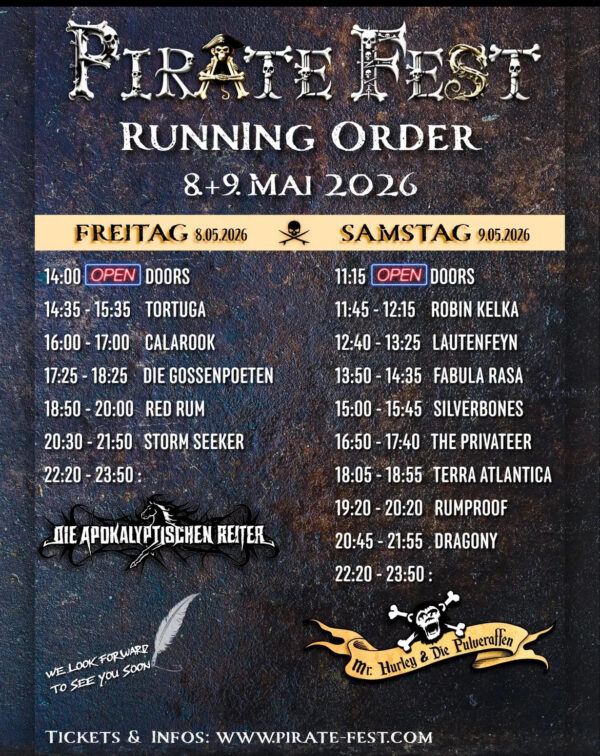 Die NO SLEEP AFTER XMAS – Crew hat in diesem Jahr neben dem Indoor-Festival im Dezember auch ein Open-Air Event auf die Beine gestellt: Das PIRATE FEST! Ein Musik-Festival mit dem übergeordneten Thema Piraten, Freibeuter und Bukaniere – und darum dreht sich auch das Beiprogramm, welches zusätzlich zu den Bandauftritten geboten wird. Passend dazu werden die Themen Mittelalter und Steampunk angerissen.
