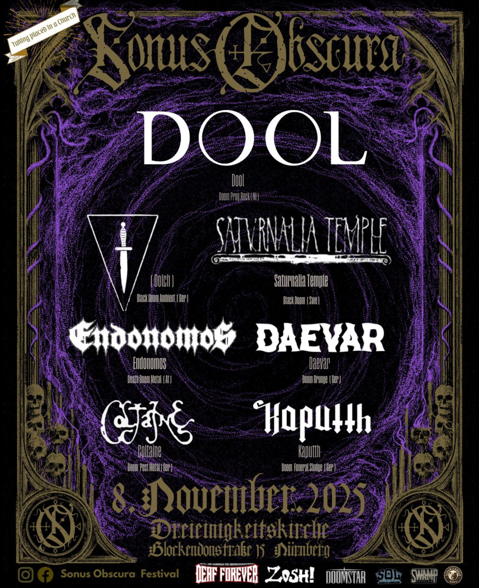 am 08. November sorgen DOOL, (DOLCH), SATURNALIA TEMPLE, ENDONOMOS, DAEVAR, COLTAINE und KAPUTTH für eine besondere Stimmung an diesem heiligen Ort.