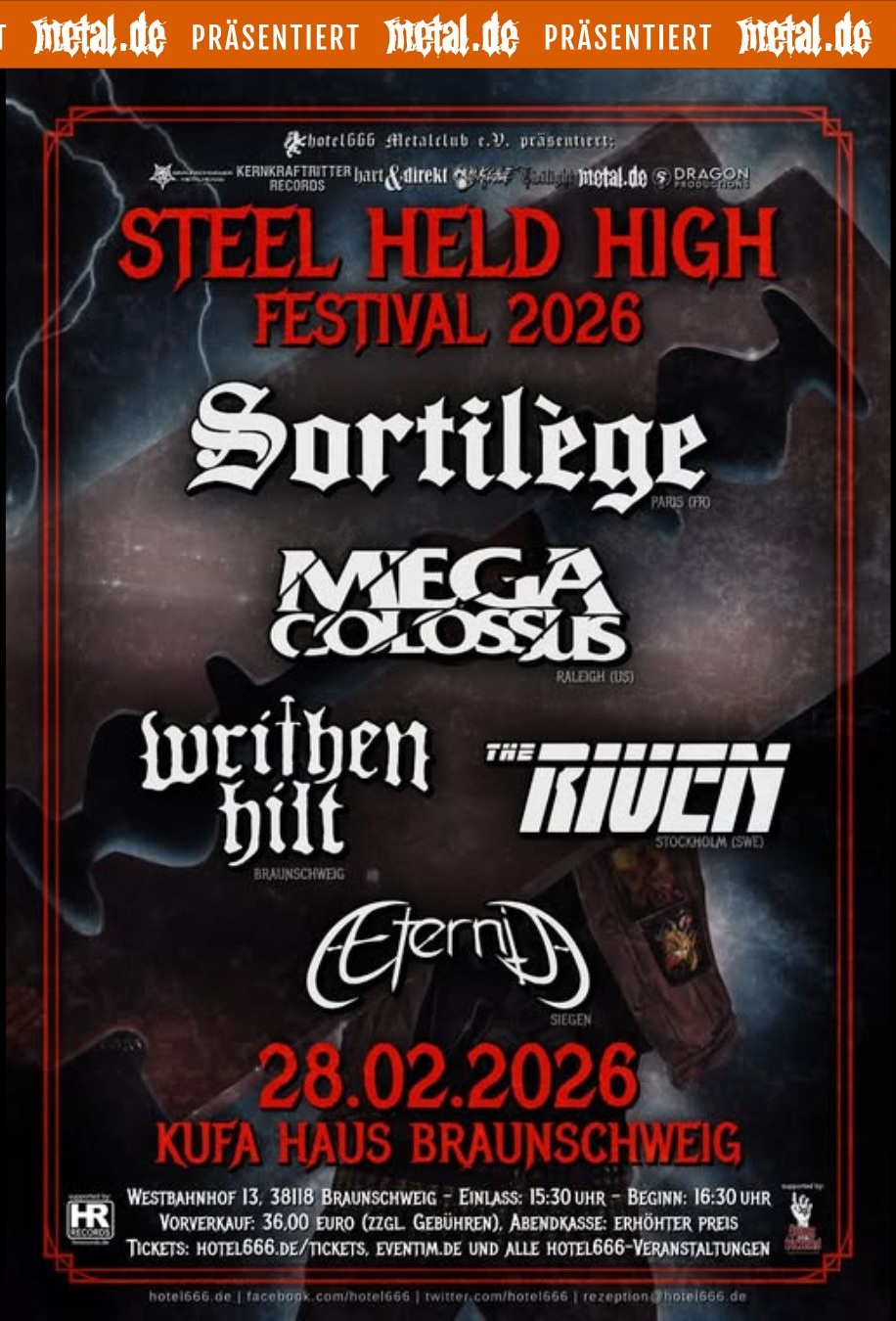 Auch 2026 wird der Stahl hochgehalten: Das Steel Held High Festival findet am 28.02.2026 zum achten Mal im KufA-Haus Braunschweig auf den Brettern der letzten Male statt.