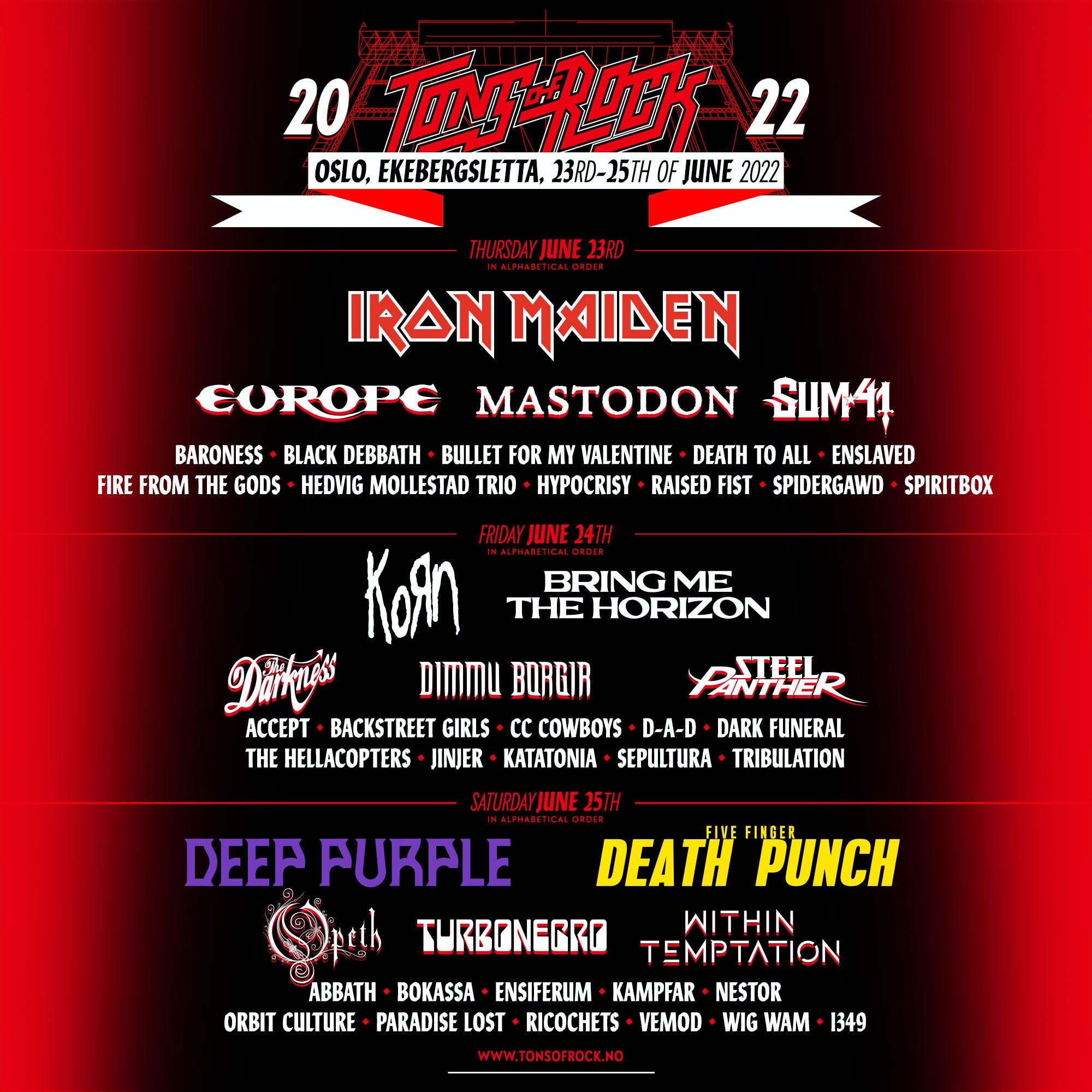 Nach zwei Jahren Corona-Pause geht das Tons Of Rock Festival 2022 in die nächste Runde. Mit gewohnt fetten Headlinern und am bewährten Ort oberhalb der norwegischen Hauptstadt Oslo statt. Der Ekebergpark ist ein spektakulärer Veranstaltungsort im Herzen von Oslo. Und das Billing ist nicht minder spektakulär: Mit norwegischen Pionieren wie DIMMU BORGIR, ENSLAVED, TURBONEGRO, ABBATH und 1349 und den internationalen Legenden IRON MAIDEN, WITHIN TEMPTATION, EUROPE, MASTODON, KORN, BRING ME THE HORIZON, STEEL PANTHER, ACCEPT, FIVE FINGER DEATH PUNCH, OPETH, HYPOCRISY und ENSIFERUM in ein und derselben Besetzung. Also ein wirklich vielfältiges Billing! Nicht vergessen wollen wir den Auftritt von DEEP PURPLE – die britischen Hardrocker um Sänger Ian Gillan hatten bereits vor einiger Zeit ihren Abschied angekündigt.