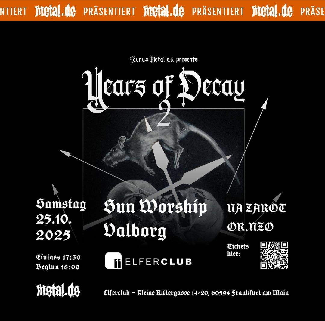 Nach dem erfolgreichen ersten Teil im letzten Jahr geht das YEARS OF DECAY in die nächste Runde. Die Verantaltung wird vom Taunus Metal e.V. veranstaltet und im Elfer-Klub in Frankfurt-Sachsenhausen stattfinden.