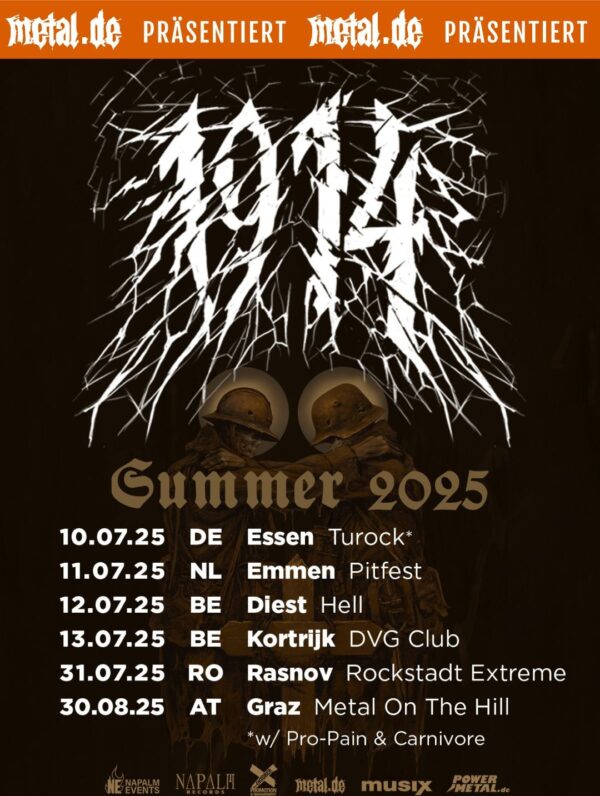 Wie es scheint, führt für 1914 nun doch noch ein Weg nach Mitteleuropa. Napalm Events haben auf ihrer facebook-Seite einen Tourflyer veröffentlicht, der zumindest sechs Termine im Juli/August 2025 ankündigt. Bisher ist nur eine Show in Deutschland, im Turock Essen, dabei, auf der 1914 mit neuem Drummer Ihor CARNIVORE A.D. und PRO-PAIN supporten werden.