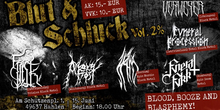 Neben den Großveranstaltungen hat die Festivalsaison auch jedes Jahr wieder kleine Perlen zu bieten: Am 15.06.2019 findet in Hahlen, Am Schützenplatz 1 (bei Menslage in der Nähe von Osnabrück bzw. Oldenburg) das Blut & Schluck Vol.2% statt. Mit dabei sind: