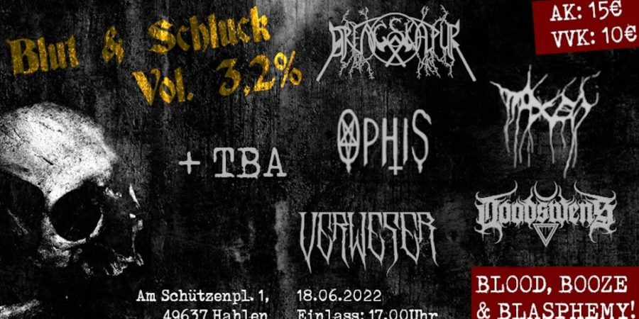 Festivals scheinen in diesem Jahr tatsächlich „regulär“ stattfinden zu können. Wie viele andere Veranstaltungen musste auch das Blut & Schluck Festival seine dritte Ausgabe, die ursprünglich für das Jahr 2020 geplant war, mehrfach verschieben. Umso größer ist jetzt natürlich die Freude, dass die Veranstalter erste Informationen und Bandbestätigungen für die diesjährige Ausgabe „Blut & Schluck Vol. 3,2%“ in diesem Jahr bekannt gegeben haben, die am 18.06.2022 in Menslage/Hahlen stattfinden soll.