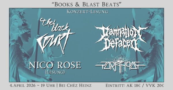 Die Melodic-Deather THE BLACK COURT aus Hannover bringen anlässlich ihres 15-jährigen Jubilums am 4. April 2026 zum ersten „Books & Blast Beats“-Abend ins Bei Chéz Heinz die beiden Welten zusammen. Für die „Seiten-Hexerei“ ist NICO ROSE verantwortlich, der als Autor, Metal-Fan und Betreiber des Blogs „Ministerium für Schwermetall“ bekannt ist und in seinen Büchern Heavy Metal und Lebenskunst zusammenbringt. Bei „Books & Blast Beats“ werden Auszüge aus Roses Werken zu hören sein. Den Abend werden DAMNATION DEFACED aus Celle headlinen, die mit ihrem intergalaktischen Death Metal Grenzen sprengen.