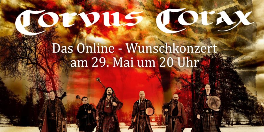 Die Spielmannsleute von CORVUS CORAX sind auch während der Pandemie weiter aktiv und laden zu einem Online Wunschkonzert am 29.Mai 2021 ein. Das bedeutet, dass der Fan über das Programm entscheidet. Via eMail können bis zu zwei Songs von CORVUS CORAX ausgewählt und an die Adresse voting@corvuscorax.de gesendet werden. Alternativ geht das Ganze auch via Social Media und der Möglichkeit Kommentare auf der entsprechenden Seite zu hinterlassen. Unter den Teilnehmern werden zehn Menschen ausgelost, welche einen persönlichen Gruß live beim Konzert präsentieren dürfen. Das Ende dieser Aktion ist der 21.Mai, 23.59 Uhr.