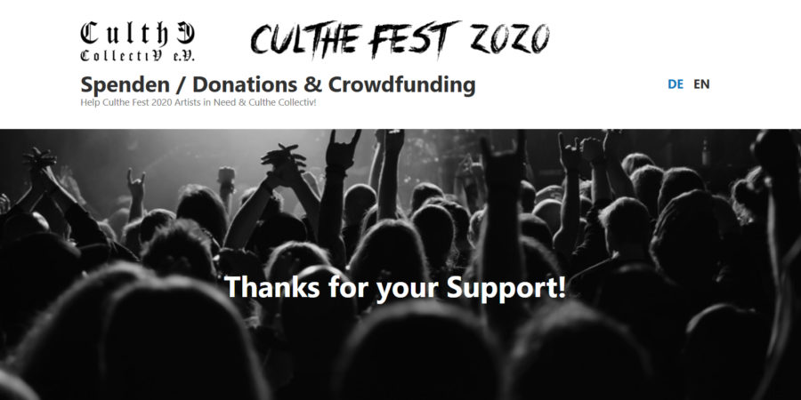 „Liebe Culthists, Wir starten hiermit eine Spenden- und Crowdfunding-Kampagne und rufen euch auf: Helft uns, die Schäden, die die CULTHE FEST 2020-Artists und wir als Veranstalter infolge der COVID-19 Pandemie und der Verschiebung des diesjährigen Festivals erleiden, abzumildern. Wir legen die Karten auf den Tisch: Es geht um die Reduzierung eines Gesamtschadens in Höhe von EUR 3.000. Alle Details findet ihr auf der Website, die wir kurzfristig als schnelle, günstige, aber hoffentlich effektive DIY-Lösung erstellt haben.
