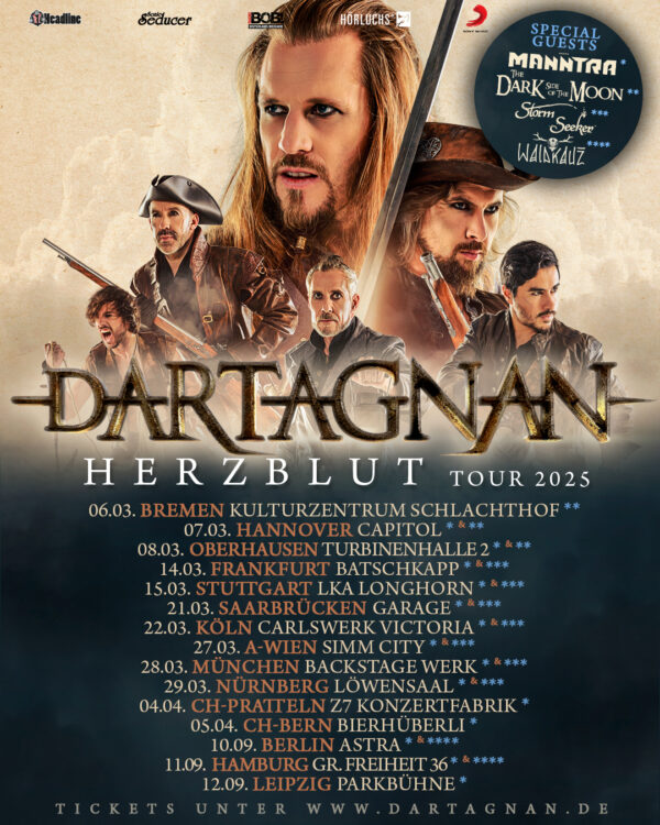 dArtagnan stehen mit ihrer „Herzblut Tour 25“ vor ihrer bisher umfangreichsten Konzertreise durch Deutschland und Österreich. Die Band, die seit 2015 aktiv ist, hat sich mit ihrem Stil aus Folkrock und mittelalterlichen Elementen eine treue Fangemeinde aufgebaut. Ihr aktuelles Album „Herzblut“, das im Juli 2024 erschienen ist, stellt einen weiteren Entwicklungsschritt dar und vereint akustische und elektrische Klänge auf einem neuen Niveau.