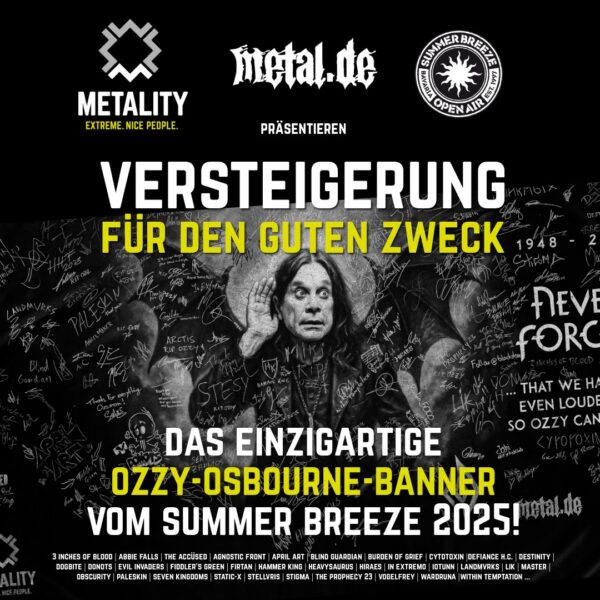 Ein außergewöhnliches Stück Festivalgeschichte gelangt unter den Hammer: METALITY E.V. präsentiert die Charity-Auktion eines eindrucksvollen OZZY-OSBOURNE-BANNERS, das beim SUMMER BREEZE 2025 nicht nur die Aufmerksamkeit der Fans, sondern auch der Künstlerinnen und Künstler auf sich zog. Das imposante Bauzaunbanner – gestaltet von metal.de und von der SUMMER-BREEZE-CREW eigens in der ARTIST AREA platziert – wurde dort von einer breiten Riege der Metalszene signiert.
