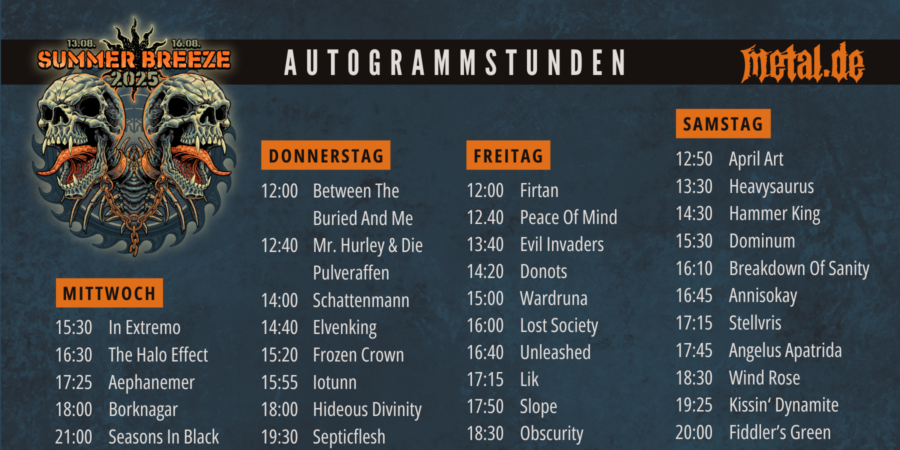 Noch ein paar Tage, dann heißt es endlich wieder: Kutten raus, Bier kaltstellen und ab nach Dinkelsbühl! Das Summer Breeze steht vor der Tür, und wenn das Wetter mitspielt, gibt’s dieses Jahr endlich Sonne statt Schlamm, also Daumen drücken! Von Mittwoch bis Samstag habt ihr bei unseren Autogrammstunden jede Menge Gelegenheit, Bands hautnah zu erleben und euch Shirts, Vinyls oder direkt die blanke Haut signieren zu lassen. Bierchen auf, gute Laune eingepackt und los geht’s zu einer fetten Festivalwoche voll Metal, Meet & Greets und bester Stimmung.