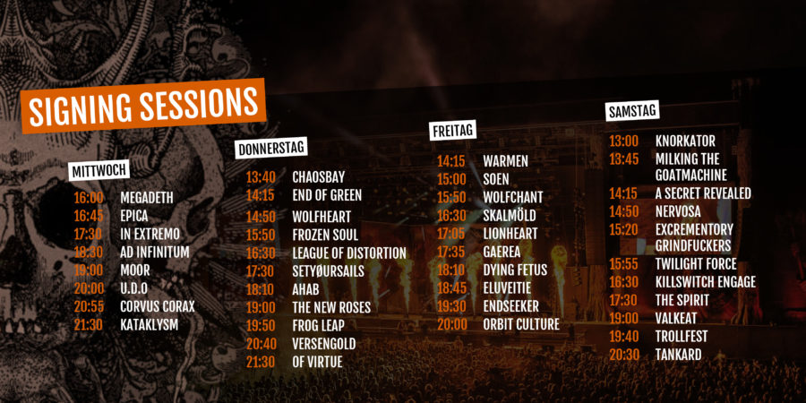 Megadeth, Epica, In Extremo, Ad Infinitum, Moor, U.D.O., Kataklysm, Corvus Corax, Chaosbay, Frozen Soul, League Of Distortion, SetYøurSails, Ahab, The New Roses, Frog Leap, Versengold, Of Virtue, Soen, Wolfchant, Skálmöld, Lionheart, Gaerea, Dying Fetus, Eluveitie, Endseeker, Orbit Culture, Knorkator, Milking The Goatmachine, A Secret Revealed, Excrementory Grindfuckers, Nervosa, Twilight Force, Killswitch Engage, The Spirit, Trollfest und Tankard auf Tour