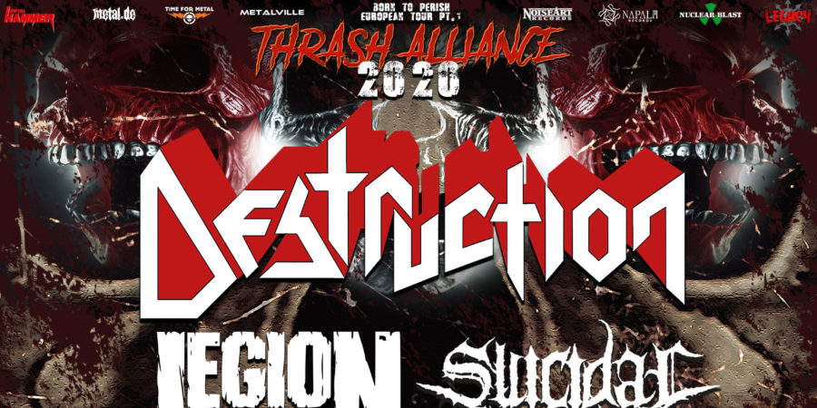 Die von metal.de mit präsentierte Thrash-Alliance-Tour geht schon in weniger als einer Woche los, nämlich am 13.02 in Dornbirn, Österreich zum Auftakt. Zum Einheizen gibt es nun noch einen Tourtrailer nachgeschoben. Vier mal auf die Mütze, von alten Recken wie DESTRUCTION und LEGION OF THE DAMNED, aber auch jüngeren Bands wie SUICIDAL ANGELS oder FINAL BREATH, die bis zum heutigen Tage das Banner von „No-Bullshit“ im Thrash hoch halten.