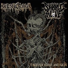 Das wichtigste Verkaufsargument vorab: FLESHCRAWL sind wieder da! Eine der ursprünglichsten deutschen Death-Metal-Bands bequemt sich nach satten neun Jahren ohne jegliches Studio-Lebenszeichen wieder aus ihren Löchern und nährt zumindest die Hoffnung, dass wir in Zukunft wieder regelmäßiger von den Bajuwaren hören werden. Für den Moment betätigen sie sich jedoch als Steigbügel für den Nachwuchs: SKINNED ALIVE heißt die kürzlich von F.D.A Rekotz unter Vertrag genommene Formation von Ferli Thielmann (u.a. MILKING THE GOATMACHINE, CARNAL GHOUL), die sich FLESHCRAWL für die entsprechend passend betitelte Split-EP „Tales Of Flesh And Skin“ ins Boot geholt haben. Jede Band steuert vier Songs bei, wobei die altgedienten den Anfang machen…