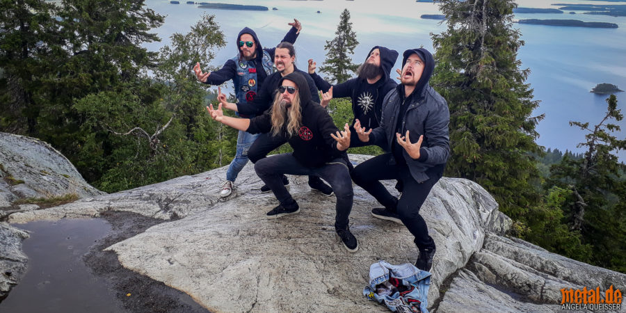 Der erste (und buchstäbliche) Höhepunkt des Tages eröffnet sich uns, nachdem wir ein Stück weitergefahren sind und auf dem höchsten Punkt entlang der steilen Klippen des Pielinen-Sees stehen. Dieser ist mit fast 900 Quadratkilometern einer der größten Seen Finnlands und hat je nach Quelle ca. 1500 bis 2000 Inseln. Hier haben INSOMNIUM ein Video zu einem noch unveröffentlichten Song gedreht. Nachdem sich jeder mal auf den Original-Felsen stellen durfte, folgt eine kleine Fotosession mit der Band, die mal ernster und mal weniger ernst für die Kameras post und sich dabei nicht vom immer wieder einsetzenden Regen aus der Ruhe bringen lässt. Mit ein paar IMMORTAL-Fotos endet die improvisierte Fotosession und es geht langsam wieder ins Tal. Ohne Fotos wären es übrigens rund 15 Minuten Fußweg gewesen.