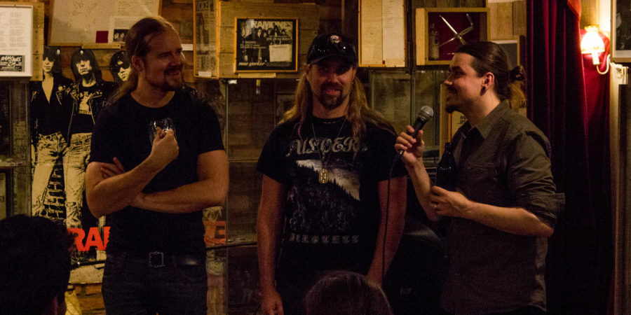 Bereits der Ankündigung im Facebook-Event war zu entnehmen, dass an diesem Abend eine etwas andere Listening Session auf die Fans von INSOMNIUM zukommen würde. Neben einem Interview zum Album und dem obligatorischen Durchhören war nämlich auch eine Lesung angesetzt. Der Hintergrund hierzu: Das textliche Konzept des neuen Albums „Winter’s Gate“ basiert zur Gänze auf einer Kurzgeschichte von Niilo Sevänen, dem Sänger und lyrischen Mastermind der Band. Außerdem handelt es sich bei der neuen Scheibe nicht um ein reguläres Album, ja nicht mal um ein normales Konzeptalbum, sondern um einen einzigen, 40-minütigen Monumental-Song. Alle Bandmitglieder mit Ausnahme des Drummers Markus Hirvonen hatten es geschafft zu kommen und verrieten im vom Veranstalter durchgeführten Interview, wie aus der fixen Idee zu einem solchen Projekt letztendlich Realität wurde.