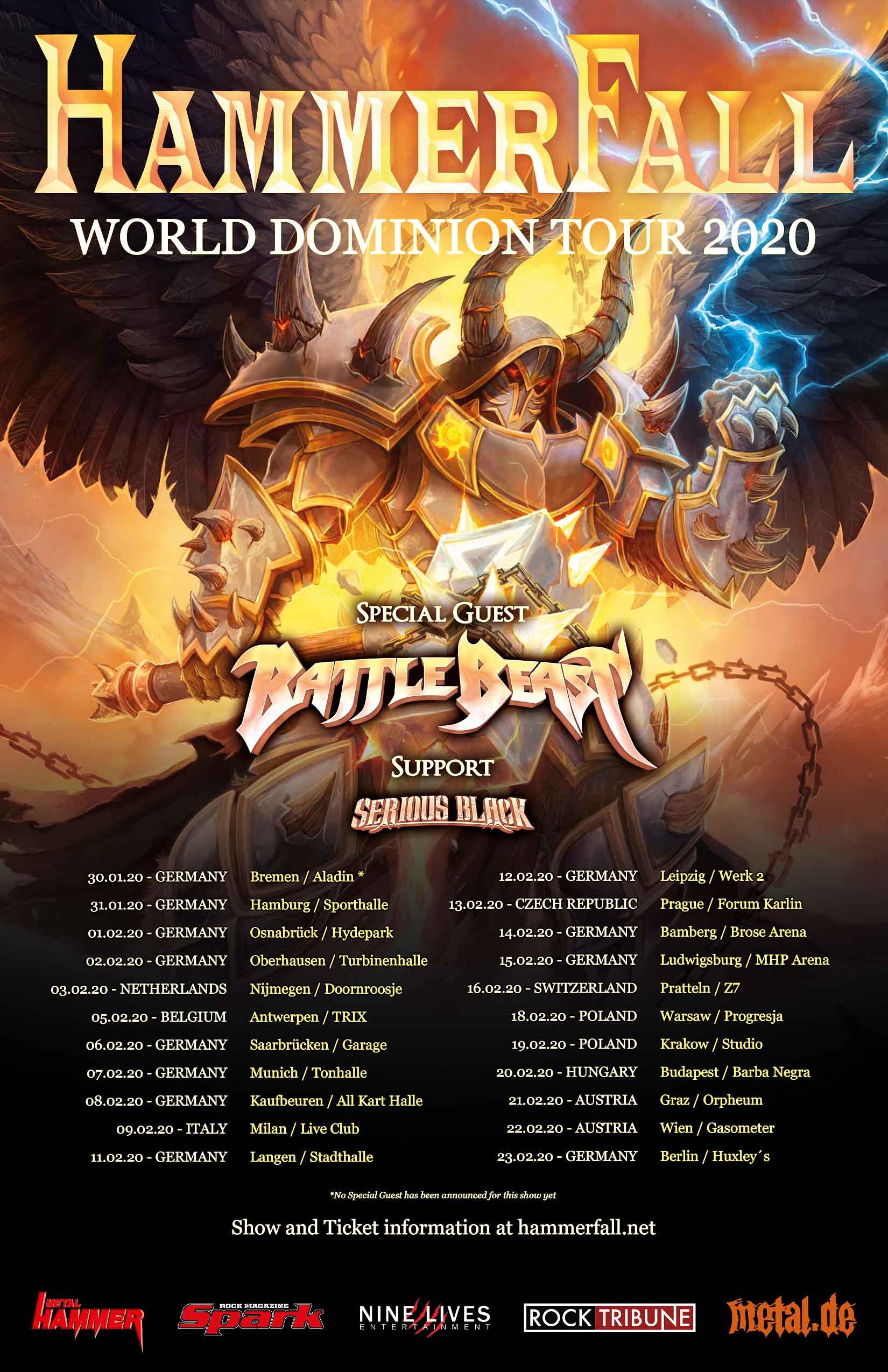 | 01.02.20 | Hyde Park, Osnabrück Hammerfall, Battle Beast und Serious Black |